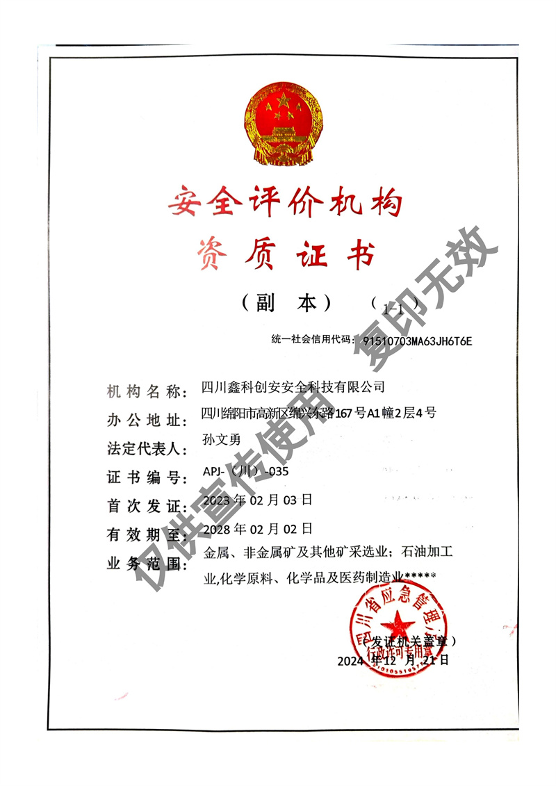 四川鑫科創安安全科技有限公司成立于2020年,是川北地區取得資質的民營安全評價機構(資質證書編號:APJ-(川)-035)。并于2022年牽頭成立綜合應急救援隊伍 - 綿陽曙光應急救援中心。